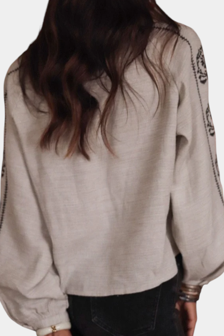 Eleva tu look diario con el Top Amara – una blusa suave de mezcla de lino adornada con bordados artesanales y mangas vaporosas. Chic sin esfuerzo con un alma vintage, es tu nueva opción para lograr ese encanto bohemio relajado.